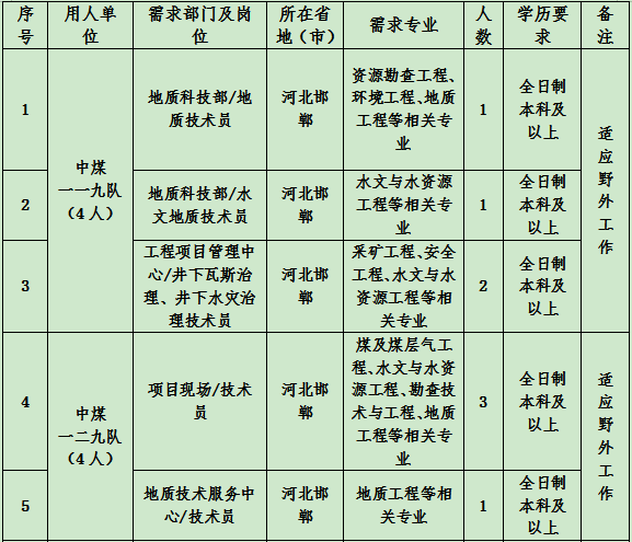 根據(jù)《中國煤炭地質(zhì)總局2023年度應(yīng)屆高校畢業(yè)生招聘公告》相關(guān)要求,結(jié)合中煤一局集團有限公司發(fā)展需要,現(xiàn)向社會公開招聘2023年應(yīng)屆高校畢業(yè)生,有關(guān)事項公告如下: