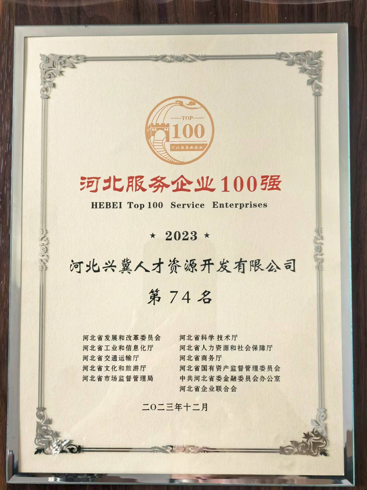 為發揮服務業龍頭企業示范帶頭作用,深化改革創新,加快構建優質高效的服務業新體系,推動全省服務業高質量發展,省發改委、省國資委等11部門聯合開展“2023河北服務業企業100強和創新領先50強”評選工作。興冀人才公司成功入圍“2023河北服務業企業100強”榜單,公司經營發展成效及業務服務水平獲得業內外一致認可。